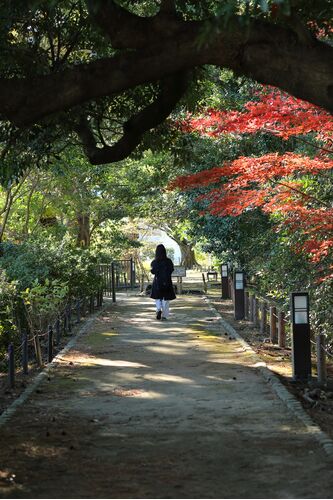 毎年周囲のモミジとは遅くに色づくモミジ そろそろかな そう思い行ってみた この場所へ行く手前 柴犬さん可愛いですね そう声をかけられた 紅葉が終わってしまい残念 そんな事を言っていたのでこの場所を案内 紅一点で赤く色づいたモミジ 喜んでいて後ろ姿を…